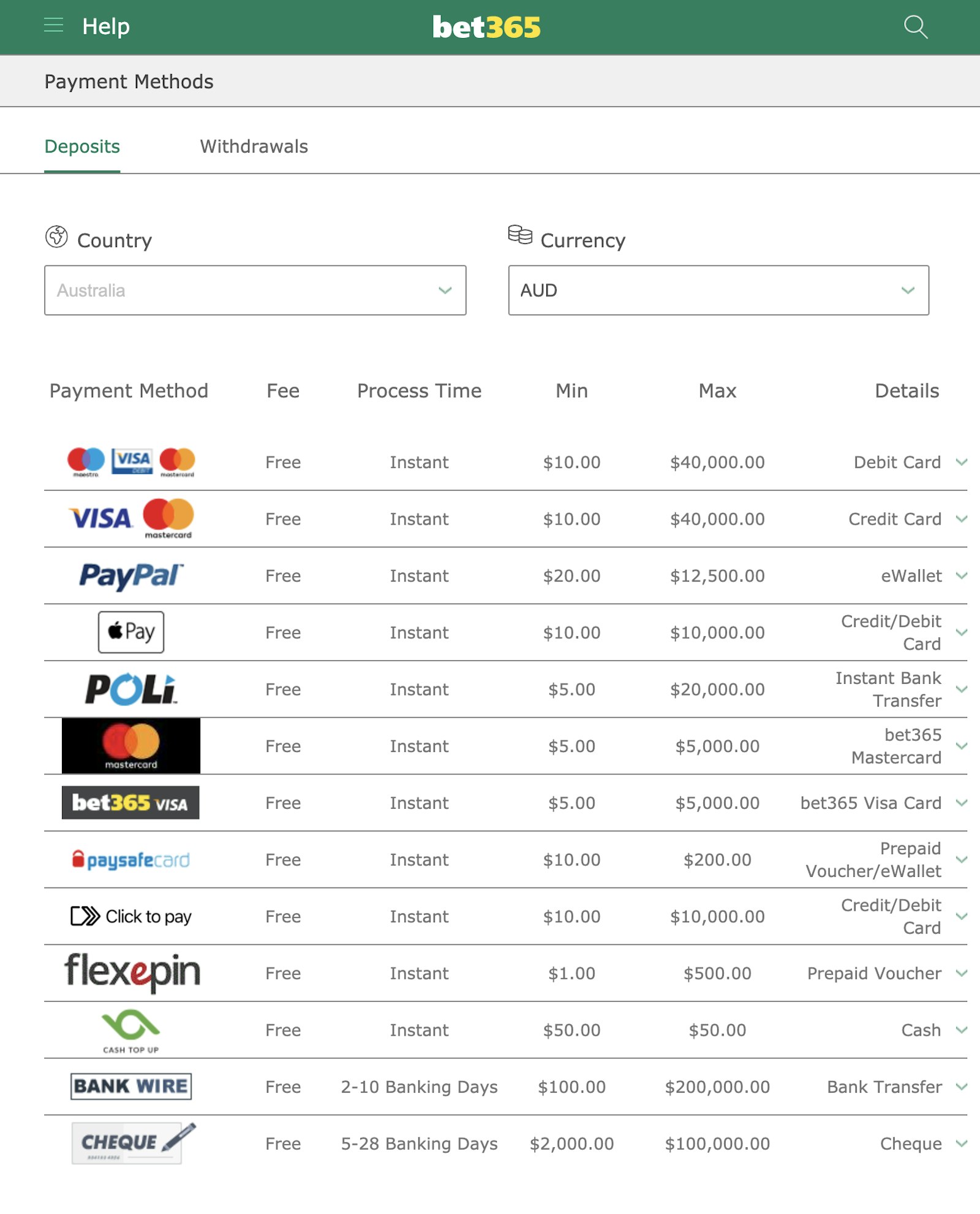 - Bet365 Australia has plenty of payment options and the most sports betting markets
