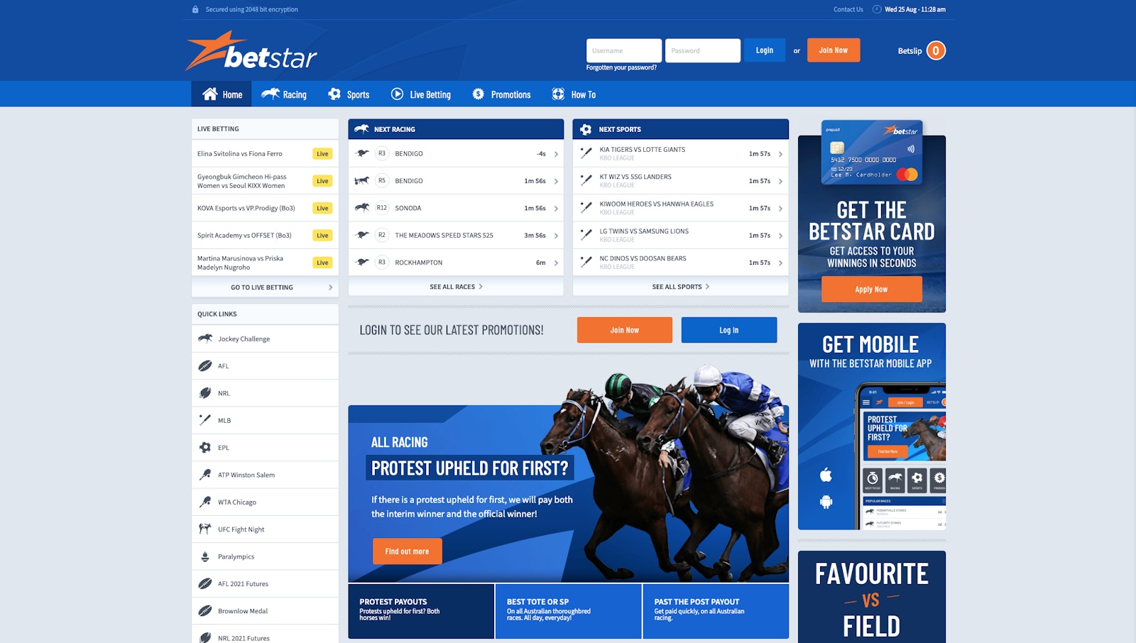 The homepage contains an overview of the next sports and races to start, the current live betting markets, Betstar's featured races, and also advertises some of the main features of Betstar like the Betstar Card, app, and their racing Protest Payout.