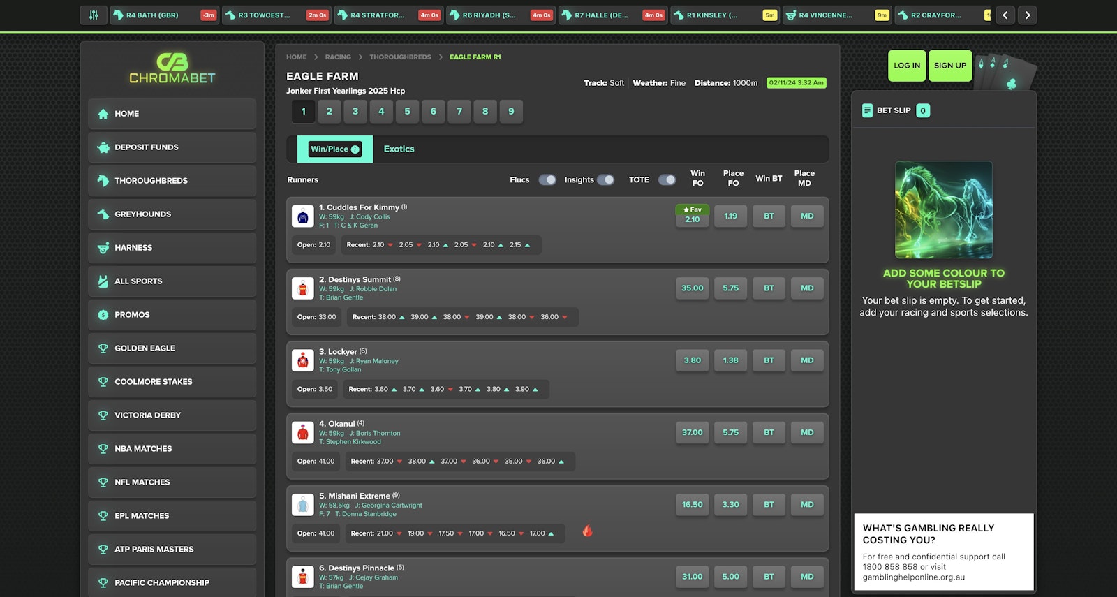The odds offered by ChromaBet are highly competitive. Fixed odds prices for local racing are decent and are generally within a 10-20 cent similarity range, give or take, with big bookmakers such as Sportsbet, Neds, Ladbrokes and TAB.