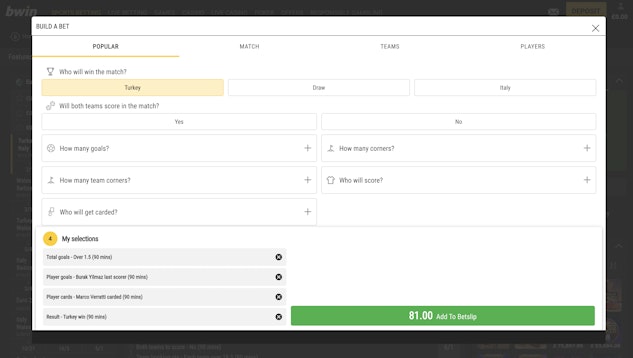 Bwin's Build A Bet function is intuitive and user-friendly.