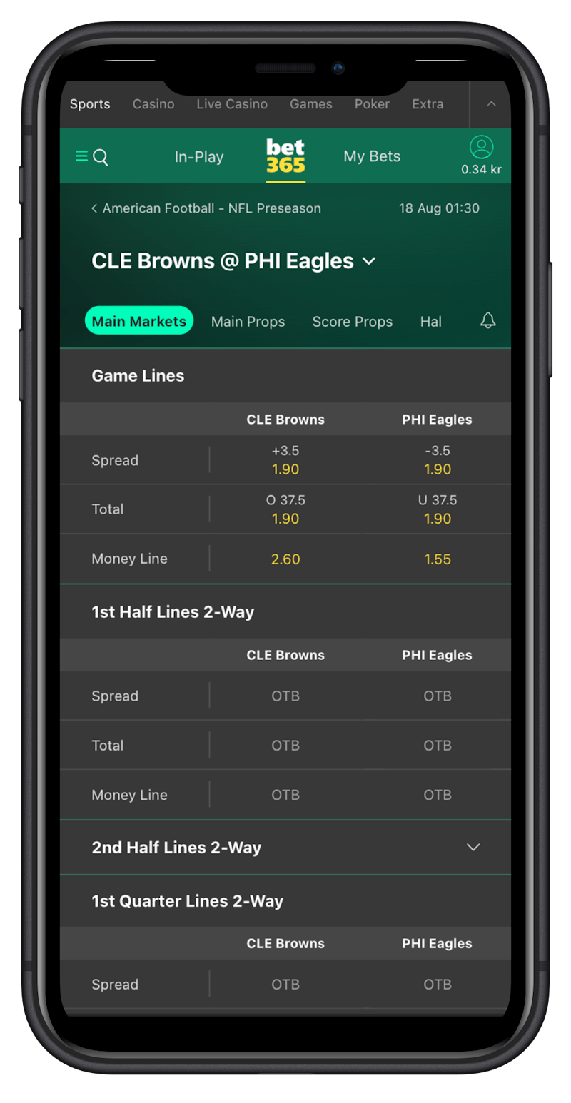 Bet365 offer up by far the best range of betting options for the NFL. You’re able to bet on player, game and score props, as well as make use of a customizable bet builder. We also liked the fact that Bet365 make so many alternative spread and totals available.