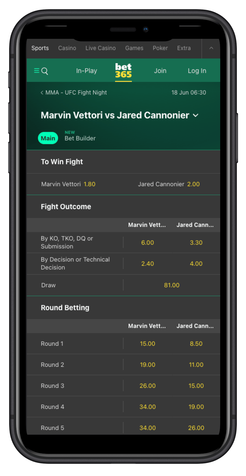 Bet365 is one of the few sportsbooks that offers more options earlier, sometimes as early as a week before Bruce Buffer does his thing.