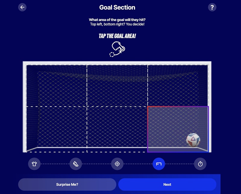 What area of the goal will they hit? Will it be top bins or drilled into the bottom corner? Click (or tap) the section of the goal you think will bulge when your selected player scores! There are six areas to choose from.