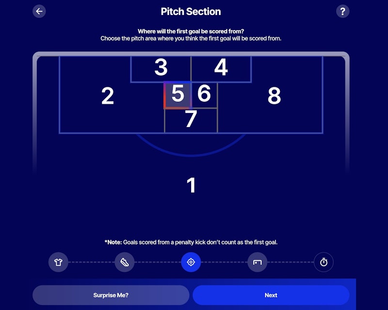 Where will the first goal be scored from? Here, you have eight different sections of the pitch to select from, with the penalty area divided into seven individual zones and outside the penalty area counting as one zone. Just click on the area/number you reckon your player may score from.
