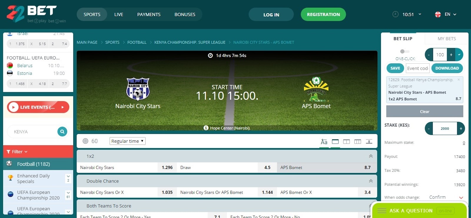 22Bet is an international betting site with a focus on football betting. 22Bet is licensed in Kenya and they accept Kenyan players with a smile.