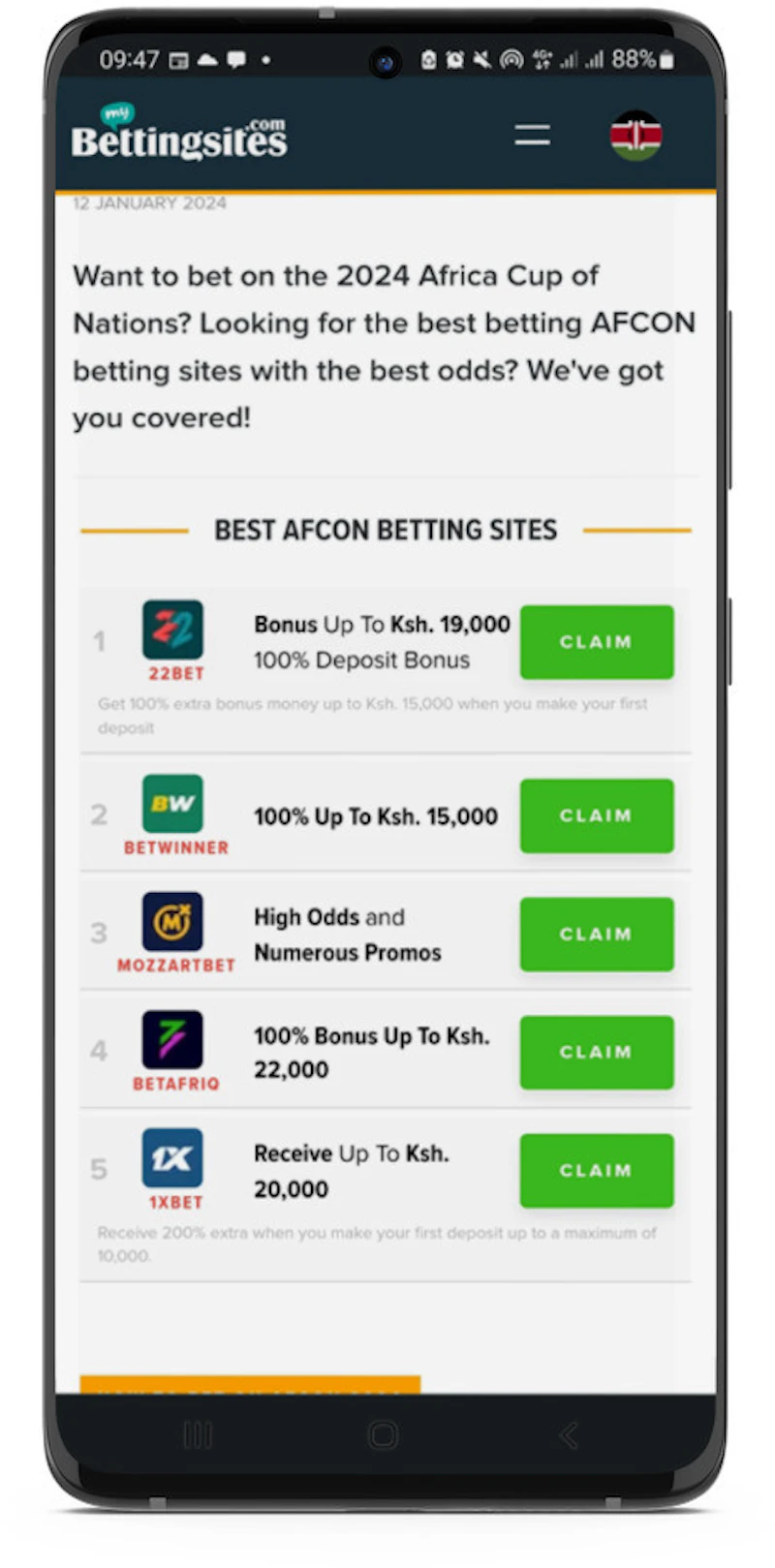Feel free to choose any of the recommended operators on our list of AFCON betting sites. Simply hit the green "Claim" button beside the betting company to get started.