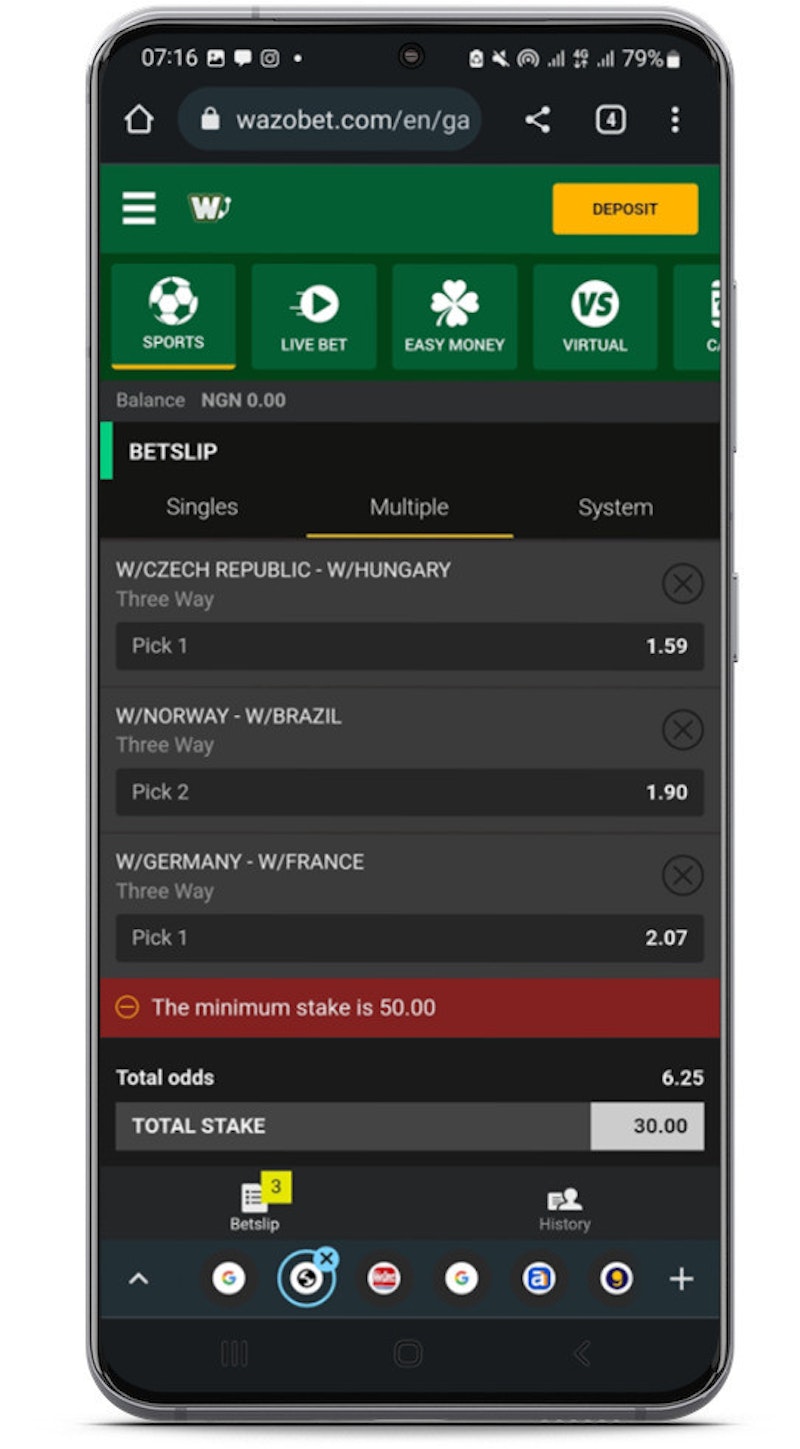 As you can probably deduce from the name of this betting site, Wazobet has a lowest stake of N50.