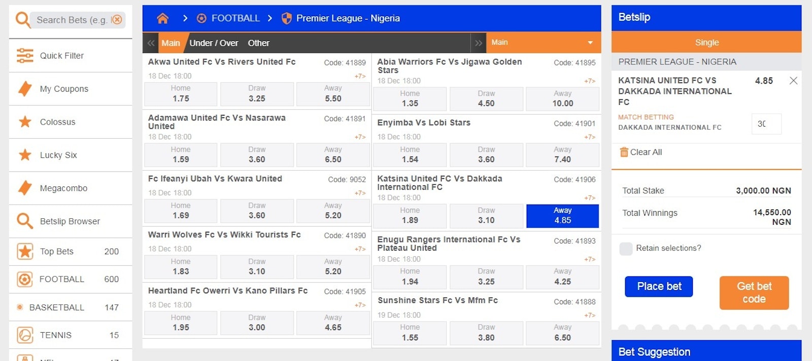 You can also try out the "Nairabet Colossus", which gives you the chance to win very big amounts with relatively smaller stakes. You can either play the colossus on your own, or join a syndicate, in which case your winnings will be proportional to your contribution to the syndicate.