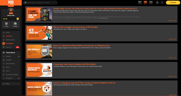 After signing up with 888sport, or even before, you can check out the 'Promotions' tab on the left-hand side of the site menu. Common offers include daily free bet options, bet refunds, odds inflations, and bet builder options. When taking advantage of these offers your winnings will often be better than any competitor out there.