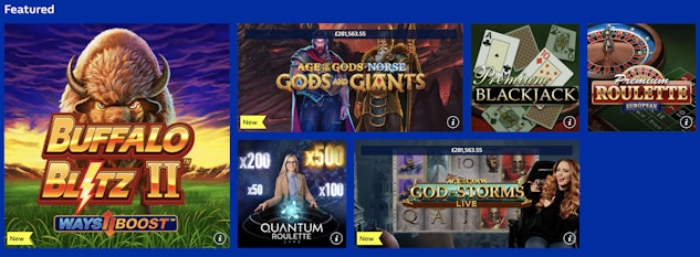 Featured William Hill Casino games include slots, jackpots, roulette and blackjack.