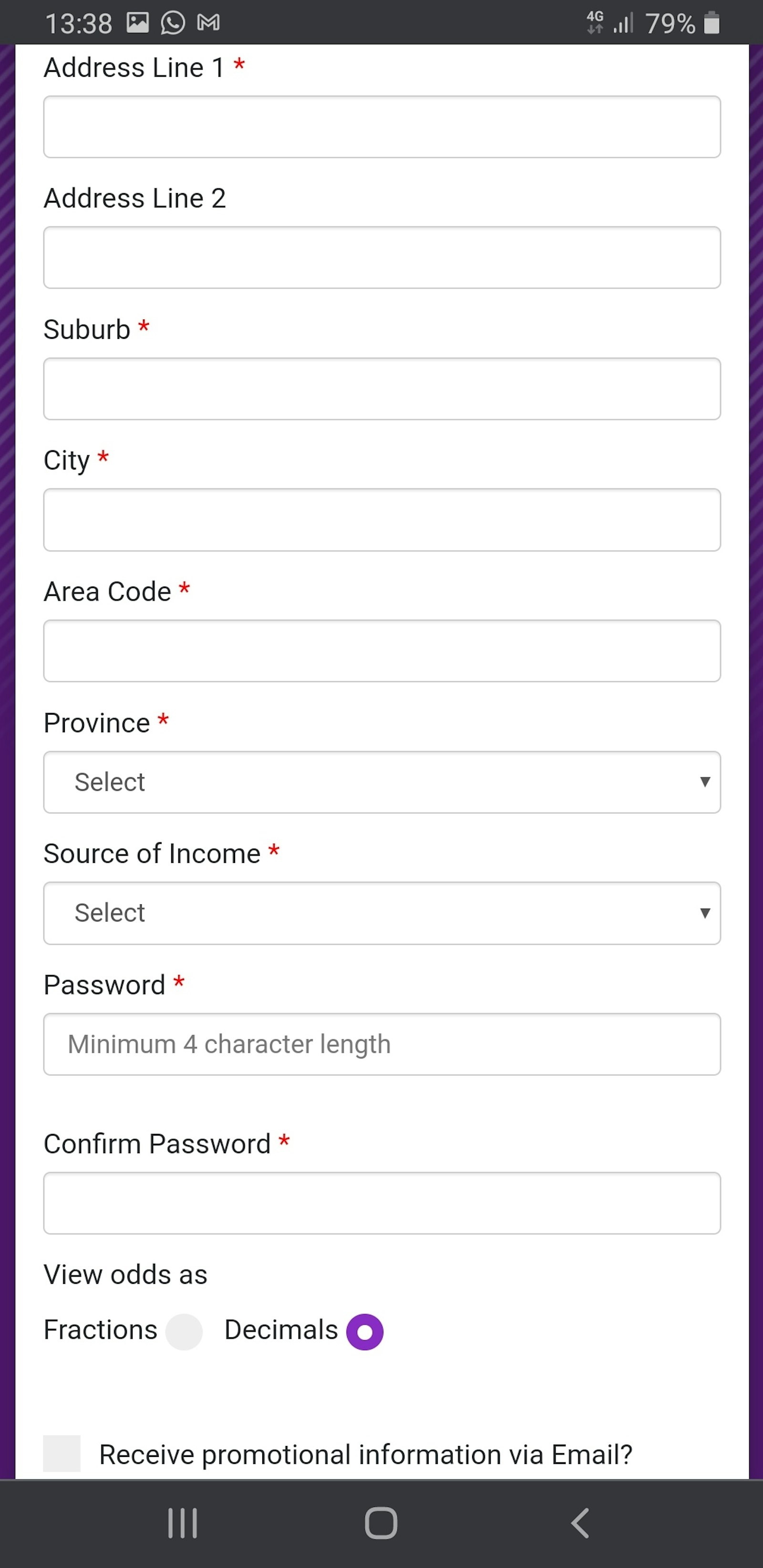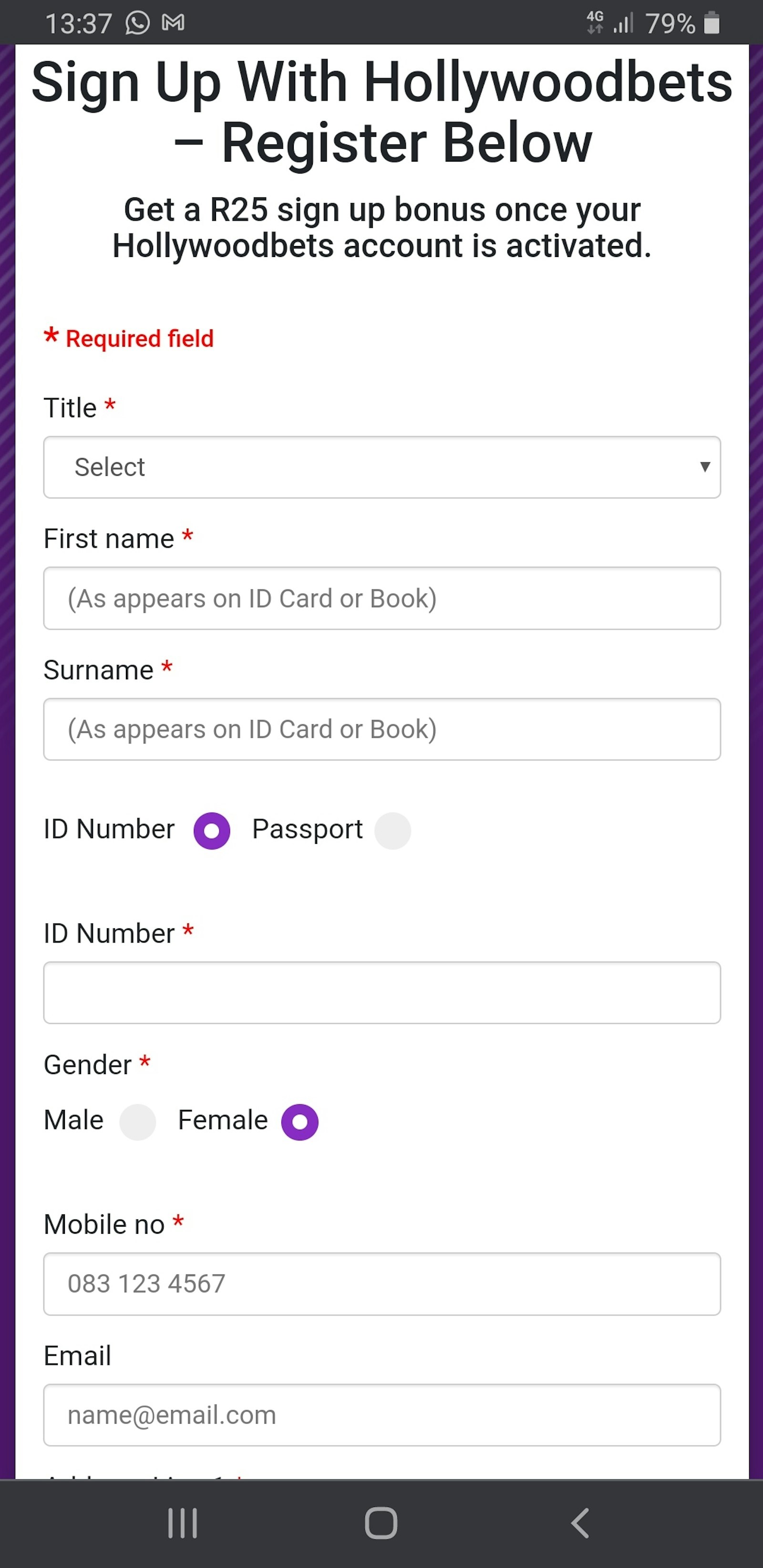 These are each of the details required from you to create your own Hollywoodbets Account: