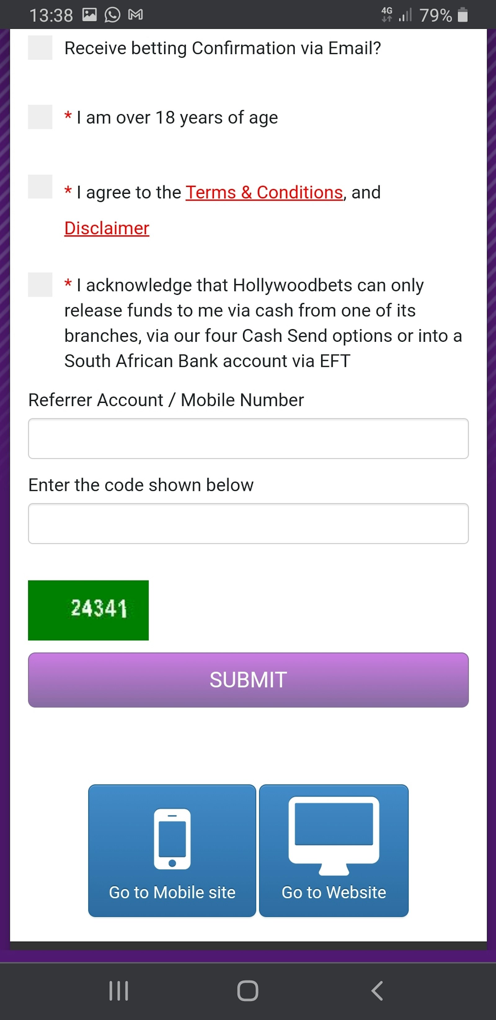 The next thing that is required of you is to simply click on the submit button, which will confirm your desire to create a Hollywoodbets Account.