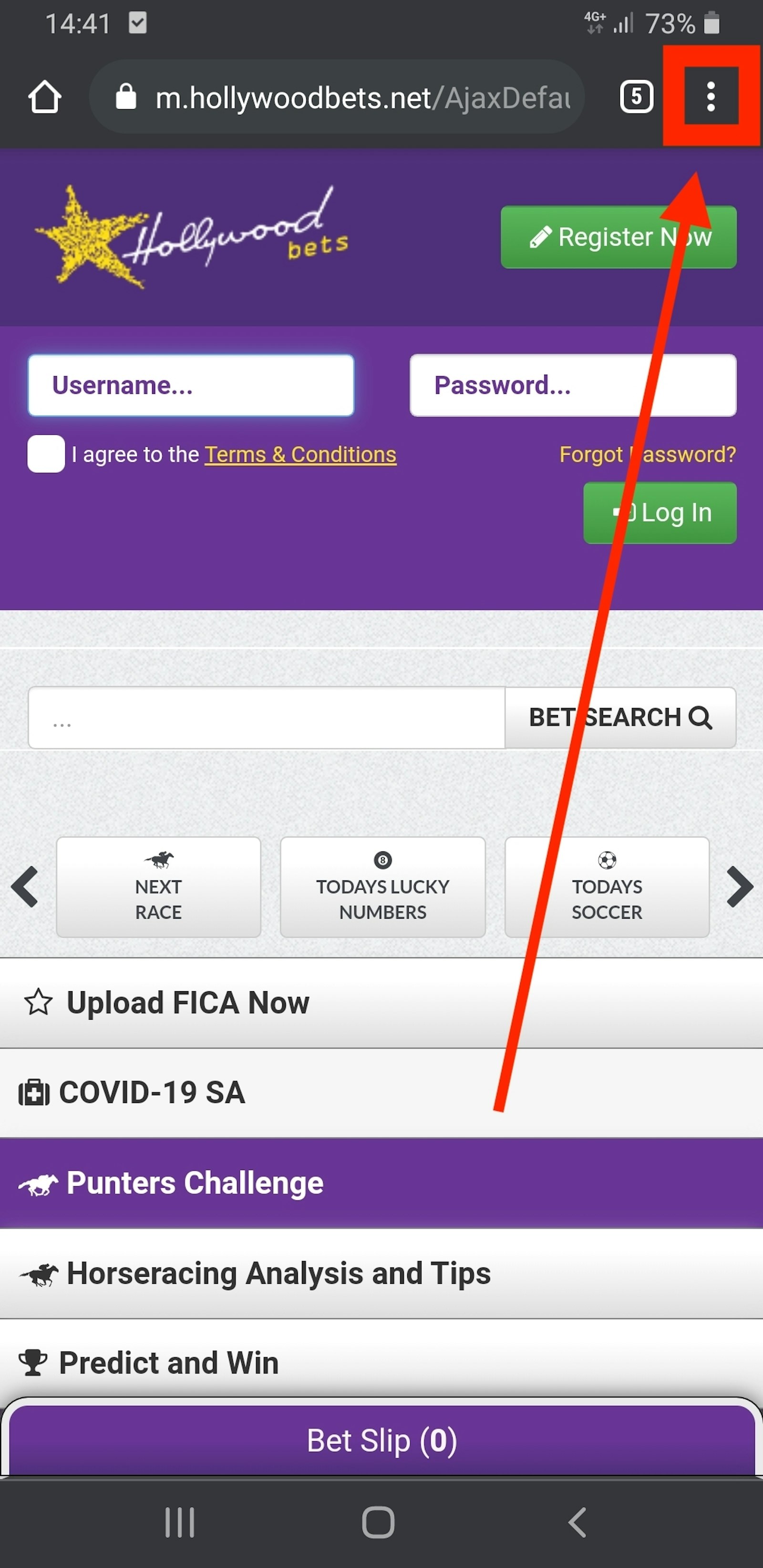 Once you’re on Hollywoodbets’ homepage on mobile, you’ll see a little icon with three vertical dots. You can see this in the first screenshot below.
